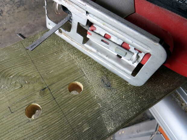 Ahora, toma hacia abajo las tiras y medir la distancia exacta entre los agujeros. Restar esta distancia de 6' (no de 8', a menos que no desea que la plataforma de entrada), el resto de la mitad y hacer una marca a esta distancia de un extremo de su 2 × 8. Perfore un orificio de 3/4" en medio de la Junta. Haga otra marca utilizando la medida entre los agujeros. Ahora perfore dos orificios de 3/4", cada 1-2" ambos lados de su marca y ambos en medio de la Junta. Obtener una sierra de calar y hacer dos cortes entre los agujeros para hacer una ranura de 2-4" de largo. Repita para el otro lado del árbol. La ranura permite los árboles moverse sin destrozando su casa del árbol - más su movimiento de árboles, el más largo la ranura debería ser (nota que las ranuras que corte solamente cerca de 2" de largo, pero estos árboles no se mueven perceptiblemente a la altura de la casa del árbol, incluso en un fuerte viento. Si sus árboles se mueven apreciablemente, o si usted está planeando construir más arriba, utilizar un soporte de viga deslizante).