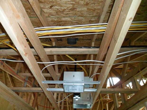 El eléctrico bruto es en!  Que eventualmente significa calor!  Los 2 electricistas funcionaron a 220 v, 110 v en cable de 12 y 14 cable, circuitos GFI, cable, timbre, toma de tierra para el gas, accesorios y una caja de servicio!  Si es alambre - lo hicieron.  Y al parecer bien - por lo menos el inspector dijo que hicieron un buen trabajo y firmaron por su trabajo.  El instalador calcula 2.500' de cable en la casa.  He contado 302 agujeros de postes y placas de pared para los cables!  Gracias a Dios para taladros de ángulo recto!  He llegado a la conclusión de que después de todos los agujeros en los postes de madera, la madera ya no sostiene la casa juntos - es los cables y tubos! Ponen en las placas del protector en los postes donde los cables pasan por los postes de madera.  Creo que los electricistas utilizan sus martillos más que un carpintero.