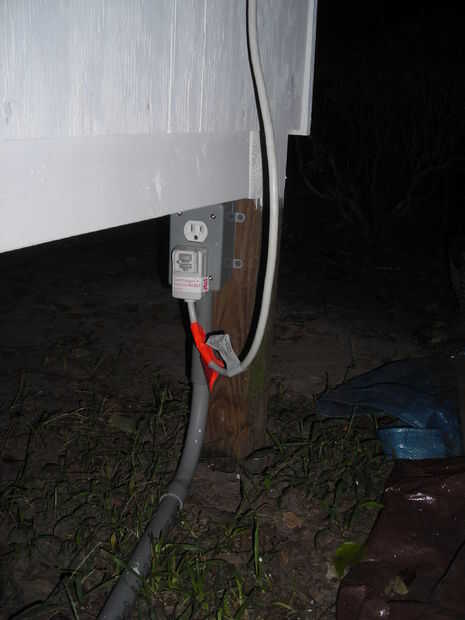 Luego el conducto exterior y alambre se ejecutan desde el interruptor de "afuera" en la casa a una toma de corriente en uno de los puestos.  Si se hace sobre esto sería enterrado para evitar perro masticando en el conducto, que afortunadamente no ha sucedido todavía.