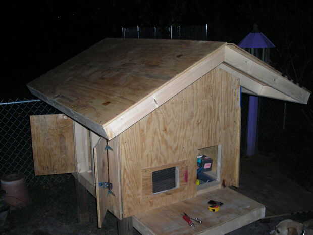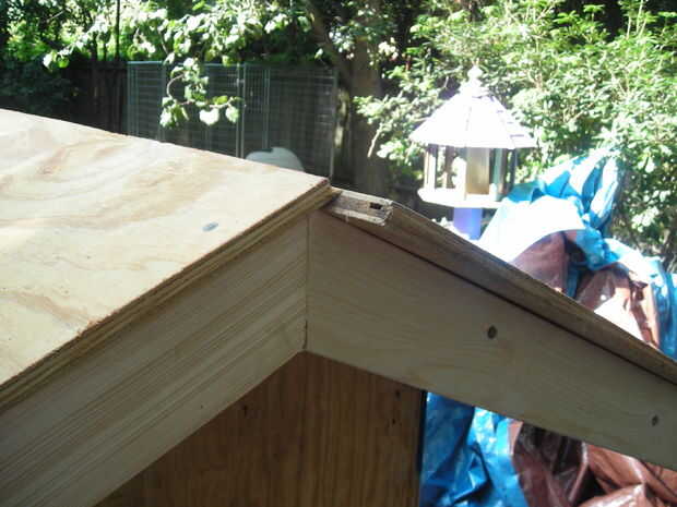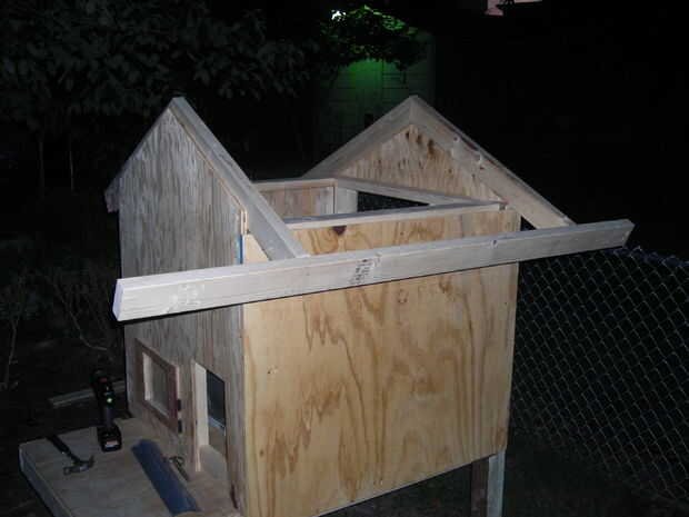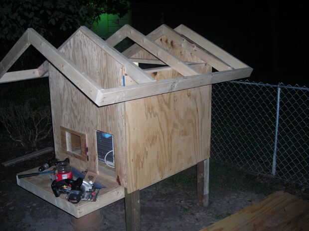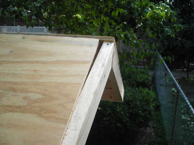 y luego el techo se enmarcó y plyed.  El V-como cerchas fueron construidas primero.  A continuación 2 de las cerchas fueron sujetados a la parte delantera y trasera madera contrachapada.  Siguiente los pernos partidos hicieron lo suficiente para cubrir el porche y el aire y sujeta a las 2 cerchas 1.  Luego las cerchas restantes fueron sujetadas en su lugar.  Después se completó el marco de la madera contrachapada se corte y sujetada.  En este punto la estructura del techo no será cuadrada, pero si cuadrado en la parte inferior izquierda y derecha del marco de la el exceso en la parte delantera o trasera puede ser cortado y utilizado para componer el defficit en la parte delantera o trasera (ver foto 4 y 5).