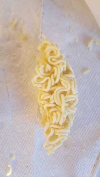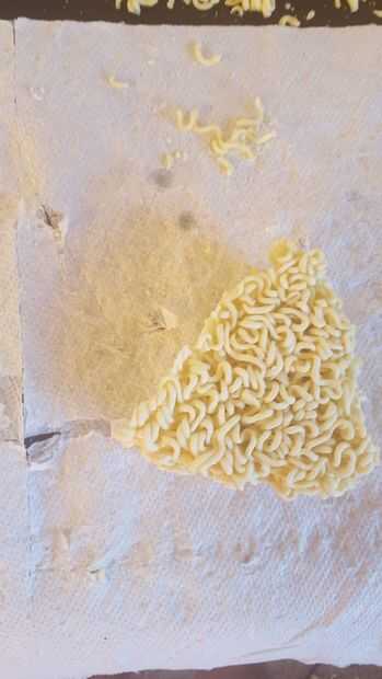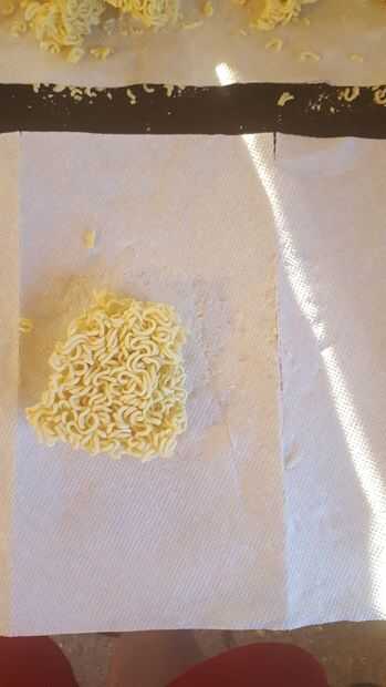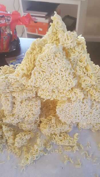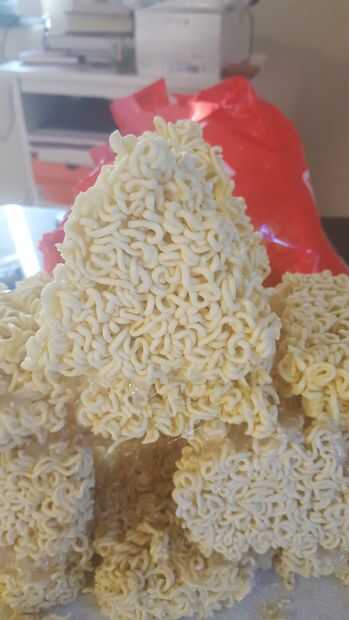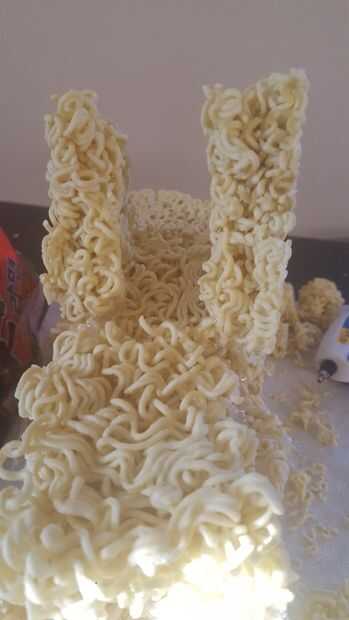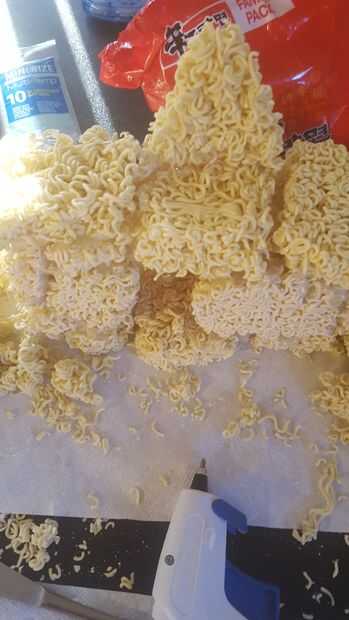 Empezar por dos bloques de forma de triángulo de ladrillos de ramen, similar a la primera imagen de talla. Pegamento la primera a la cima en seguida por la segunda como se muestra en los cuadros 3 y 4. Luego tallar dos formas trapezoidales, como el quinto cuadro, estos serán los lados del campanario. Pegue los lados del campanario primero sobre las piezas triángulo existente mediante la aplicación de pegamento en las piezas trapezoidales donde tocarán las piezas del triángulo. Mantenerlos firmemente por mientras el pegamento seca.