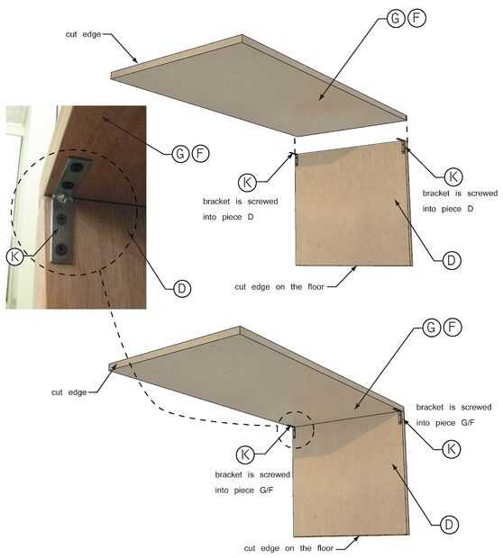Ate pedazo G a D con soporte de K y tornillos 1. Asegúrese de que los soportes K se unen en los bordes como se muestra para asegurar que los tornillos van en la parte estructural de la puerta.
