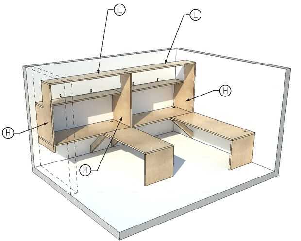 Las piezas de L (2) restantes son para ser pegado o atornillado a la parte superior de las piezas de H (3).