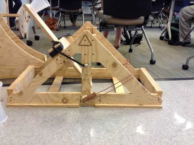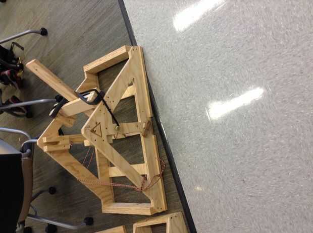 Queríamos que nuestra catapulta para tener una barra de parada ajustable para controlar cuánta distancia conseguimos de proyectil. También, hemos construido una sólida base para que no tambalee. Hemos intentado añadir tanta tensión a la palanca como sea posible que el máximo poder salir de él. Utiliza bandas elásticas y trenzado de cuerda para sostener la palanca y la tensión. Por lo es nuestra catapulta.