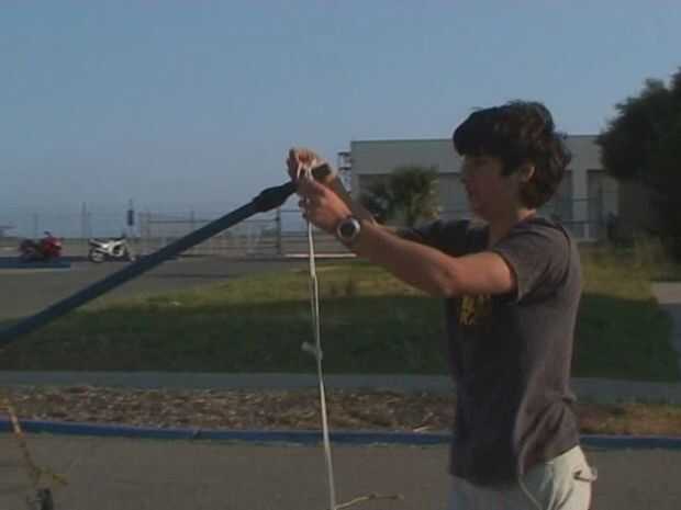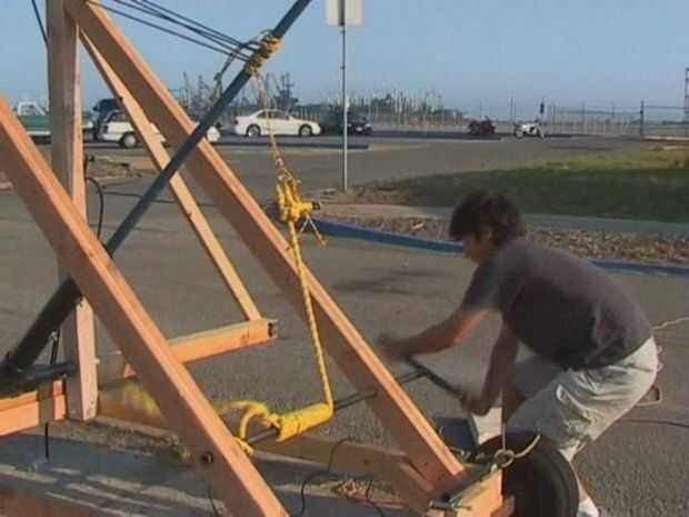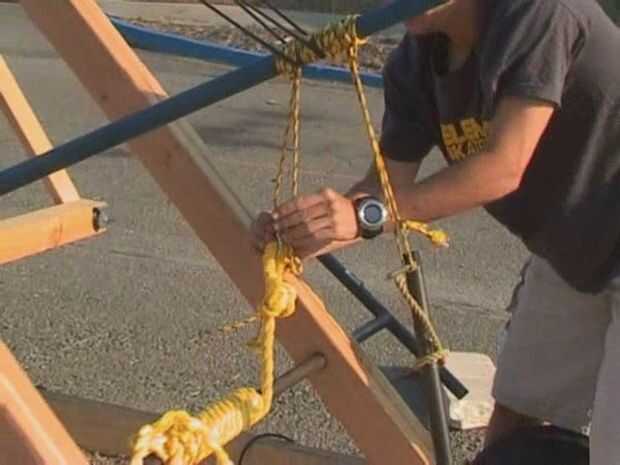 Bloquear el brazo en su lugar con el perno de la leña, cargar tu proyectil y sacar la cuerda de bobina.