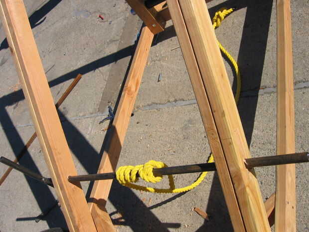 Atar un extremo de la cuerda de nylon alrededor del carrete y el otro extremo alrededor del gancho del S. A utilizar esto más adelante para tirar hacia abajo el brazo, luego desenganchar para preparar al fuego.