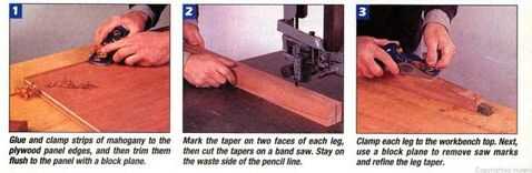 Encolar y sujetar las tiras. Después de 20 minutos, raspe el exceso de cola y, a continuación, deje que la curación de pegamento. Utilice un plano para recortar el borde de color en el panel (Foto 1). A continuación, corte los paneles de dimensión final. RIP y las patas de la mesa de corte transversal y marcar sus perfiles cónicos. Utilice una sierra para cortar las patas a la forma (Foto 2). Sujete cada pata a la mesa de trabajo, y luego usar un plano de bloque para eliminar las marcas de la sierra (Foto 3). Colocar las ubicaciones de las ranuras de la placa de Unión en los lados, atrás, abajo y las piernas. Utilice la ensambladora para cortar las ranuras de todos excepto los de las patas traseras que reciben la parte posterior del caso.
