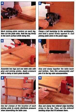 A continuación, unir los paneles de la parte posterior e inferior con unirse a placas, pegamento y grapas (foto 7). Completar la base uniendo este subconjunto con los paneles laterales y las piernas (Foto 8). Corte el panel de madera contrachapada para la parte superior de la tabla y preparar las bandas de borde. Corte de ingletes en los extremos de dos piezas de las bandas de borde para que corresponden a las dimensiones de la parte superior y luego pegar y a la parte superior de la abrazadera. Corte a inglete los extremos en las restantes bandas de borde, luego pegamento y fije a la parte superior (Foto 9). Cepille suavemente el borde hasta la parte superior después de que el pegamento ha curado y corte la moldura en las bandas de borde con una broca de router y Cala. Se utilizó un corte poco profundo la ensenada, pedacito (artículo Nº 387, Profesionalizados, caja C/4053-24, Rydal, PA 19046; 800-533-9298). Corte ranuras de la placa de Unión en la parte inferior de la mesa y luego pegar la tapa a la base de la mesa usando procedimientos estándar de unirse a la placa de la abrazadera.
