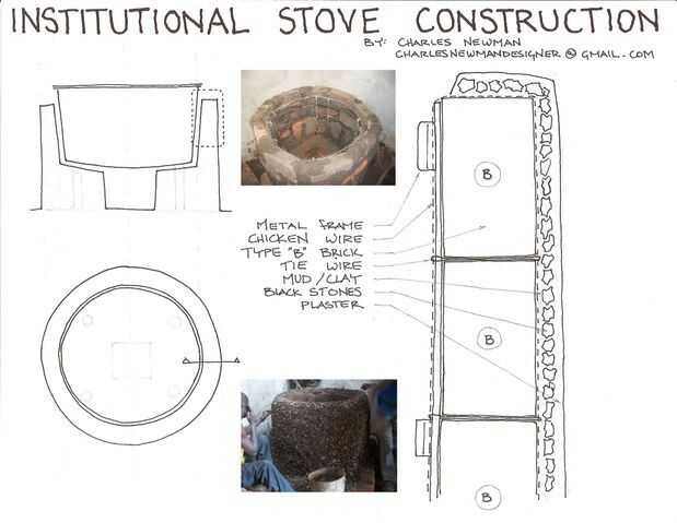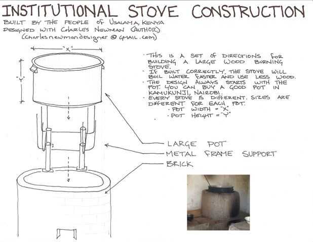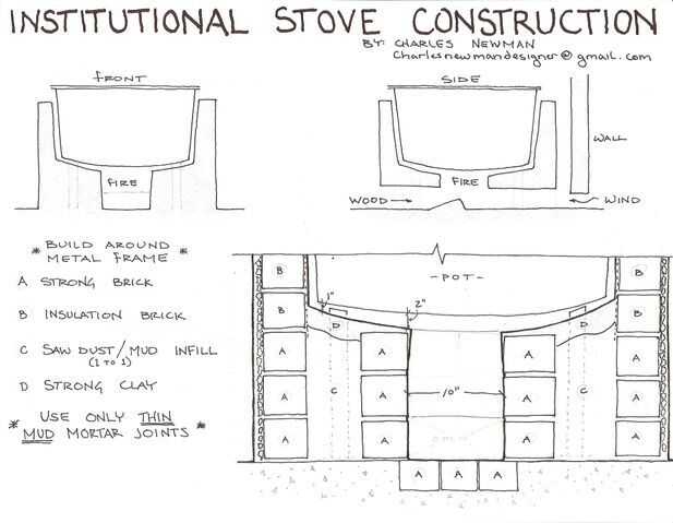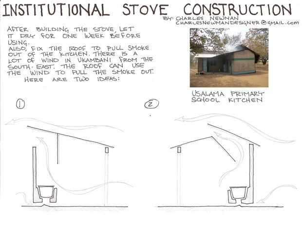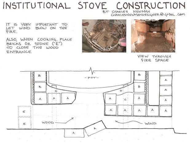 para obtener toda la eficacia de ahorro de madera y poder minimizar por el humo de la combustión limpia estufas hogar a una escala mucho mayor, ofrecemos esta guía para construir una estufa de tamaño profesional para empresas, escuelas o clínicas. La guía es dibujado a mano por Charles Newman, un arquitecto y miembro de los ingenieros sin fronteras – capítulo profesional de Estados Unidos Nueva York. El año pasado, Charles había construido e instaladas tres versiones de esta estufa en la cocina de la escuela primaria en Usalama, Kenia. Las estufas son parte de una renovación de cocina que realizó en el más delgado de los presupuestos ("$0.00," usando un presupuesto sobrante de un proyecto anterior y repurposed piezas), que se puede leer aquí . Los fogones se cocinan todavía en Usalama, y una copia de esta misma guía reside en la biblioteca de la comunidad.