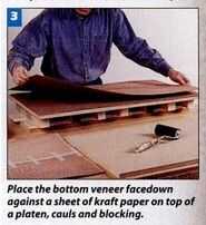 Para ello, hacer cauls de madera 2 x 4 y plano una corona 1⁄6 pulgada en un extremo de cada lóbulo. A continuación, cortar dos piezas de madera contrachapada de 3⁄4 pulg a las mismas dimensiones que el panel que se pega para arriba. Son los llamados cristales de exposición. Los cauls toman la fuerza de la pinza y extensión hacia fuera, la extensión posterior de rodillos la fuerza de sujeción de los cauls. El resultado es uniformemente aplicado presión que se adhiere cada pulgada cuadrada de la chapa del núcleo. Para comenzar el proceso de pegamento, colocar bloques de madera de desecho en la mesa de trabajo para proporcionar espacio para el jefe de las abrazaderas. Sobre el bloqueo, coloque los cauls corona hacia arriba. Coloque un plato en los cauls y una hoja de papel de kraft sobre la platina. Por último, coloque la chapa en el papel, con la cinta de chapa frente a papel (Foto 3).