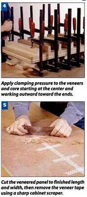 A continuación, utilice un rodillo de espuma para cubrir una superficie del panel base con pegamento. Hemos tenido buenos resultados con Titebond Extend (véase lista de materiales). Coloque la cara cubierta de pegamento de la base contra la hoja de chapa. Luego, Aplique pegamento en la otra cara de la base. Coloque la chapa del sapele, lado de la cinta, sobre la base. Coloque una hoja de kraft de papel sobre la chapa de madera y un rodillo sobre el papel, seguido por los cauls, parte de la corona hacia abajo. Coloque las abrazaderas en el centro de la Asamblea de grupo y aplique presión. Coloque las abrazaderas hacia afuera desde el centro y mantener presión hasta que la chapa se enlaza correctamente al panel (foto 4). Deje que el pegamento cure durante 2 horas, luego retire el panel y deje que se seque al aire. Raspar la cinta de chapa y cualquier pegamento que sangró por la cara de la chapa (Foto 5). Utilice la Sierra de mesa para cortar el panel a dimensión final.
