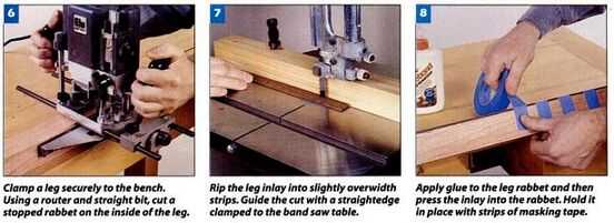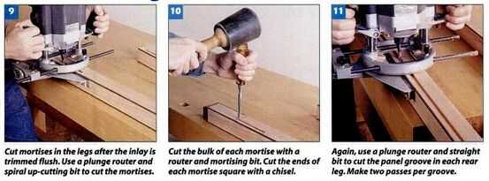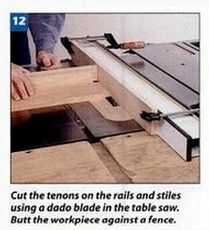 Usar una fresadora de inmersión, cerca y espiral para arriba-corte broca para cortar las mortajas de carril en las piernas (Foto 9). Luego, corte los extremos de la Plaza de la mortaja con un formón (foto 10). Utilice la misma configuración para cortar las ranuras de panel en las piernas (foto 11). Rasgar y trozar el material para el montaje del backpanel. Para cortar las espigas en los rieles, paneles y montantes, instale un disco de moldurar en la Sierra de mesa y un tope-guía auxiliar. La pieza de trabajo a la cerca a tope y ejecutarlo sobre la hoja. (Foto 12).