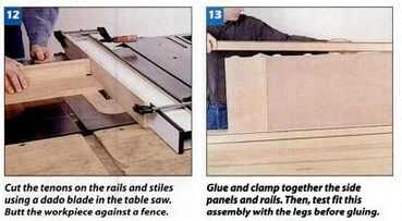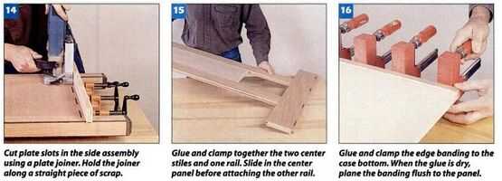 RIP y las bandas de borde de corte transversal y embutido para la parte superior. Después de cortar el rebajo en la parte superior, pegue las bandas de borde y embutido en su lugar, como se hizo en las piernas. Corte que estas piezas al ras del panel. A continuación, cortar el bisel en las bandas con un maquinilla de afeitar-agudo bloque plano (Foto 18). Corte las Unión ranuras de la placa en la parte superior, luego unir la parte superior a la caja con pegamento, abrazaderas y placas de Unión.