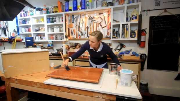Ahora mientras se secaba la base, he trabajado más en la parte superior. La clave para conseguir un acabado realmente bonito es aplicar varias capas de poliuretano y arena fina en el medio. Todos juntos poner en cinco capas de poliuretano y lijar ligeramente con lija de grano 320 entre cada capa.
