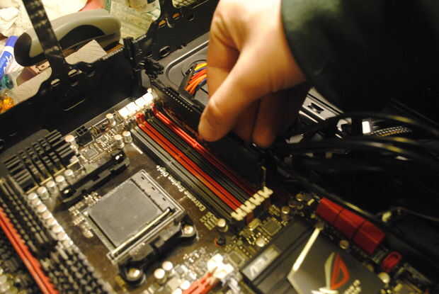 Una vez que la placa madre debe poner a tierra el caso y hasta ahora es seguro instalar los componentes en la placa base. En los lados de la memoria RAM ranuras que son seguros para mantener la memoria RAM en su lugar. En algunas placas madre hay cierres en ambos lados, en otros sólo hay uno en un lado. Tire que estos de nuevo para que las ranuras no son bloqueadas por los seguros. Alinee el módulo de la RAM con la primera ranura.