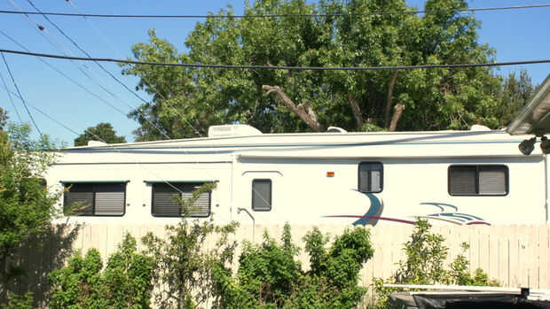 Así que decidí probar y construir algo para bloquear algunos del sol. Yo aunque sobre el uso de espaldera para disimular pero violaría ordenanza para la altura de la valla. Así que decidí hacer algo que podría poner para arriba y toma fácilmente. Además de que el calor adicional que refleja de la 5ta rueda nos salvará dinero en el invierno. :)