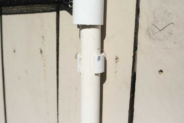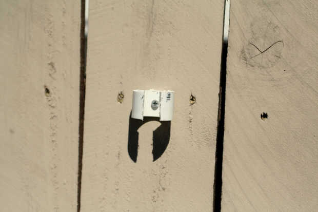 Ahora medir varios pies (si su lado de la valla es el lado del piquete) o en la parte inferior 2 x 4 (si está en el lado del poste de la valla). La más larga la distancia, mejor. Sus postes verticales van a clip en éstos y apalancamiento debe ser considerado. Consideraciones de apalancamiento con el viento es la razón por qué estamos usando abrazaderas en lugar de sólo los polos directamente a la guía de montaje. En el caso de un viento fuerte se acaba los polos pop fuera de las pinzas en lugar de rasgar la cerca entera hacia abajo. (al menos eso es la teoría). Cuanto mayor sea la distancia entre la parte superior e inferior las pinzas, más fuerte el viento necesario para arrancar los postes.