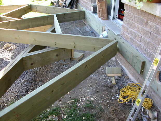 utilicé 2 tableros de contabilidad aquí para dar cabida a dos tubos de ventilación y para asegurar que tenía una superficie de conexión más allá del dintel de la entrada. Observe que he instalado el primer par de Cruz viguetas. Hay mucho por venir. Por último, este es un buen momento para empernar abajo al final de post del centro de las vigas