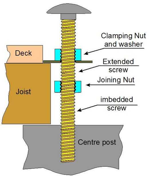 El perno de carruaje de 4 pulgadas en el puesto de centro es claramente insuficiente para extender a la parte superior de las vigas, así que para arriba-terminó un segundo tornillo y conectados ambos pernos juntos, me da forma a las vigas. Por supuesto comencé atornillando una segunda tuerca y una arandela de gran diámetro para eso Perno segundo, antes de la mano. Esta es una solución temporal, que se alteran al terminar la tarima.