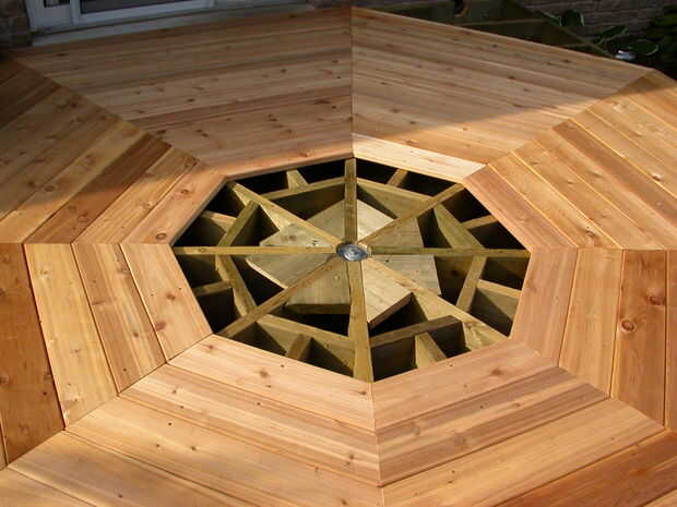 Medida que se acerca al centro de la cubierta, usted tendrá que insertar algunas viguetas de chatarra para proveer una superficie para montar la tarima. Además, puesto que el tablaje de la cubierta se sujeta firmemente a las viguetas, tenemos la oportunidad de modificar el post de centro tornillo que asegura que las últimas piezas de las tarimas se pueden sujetar en el centro, sin interferencias.