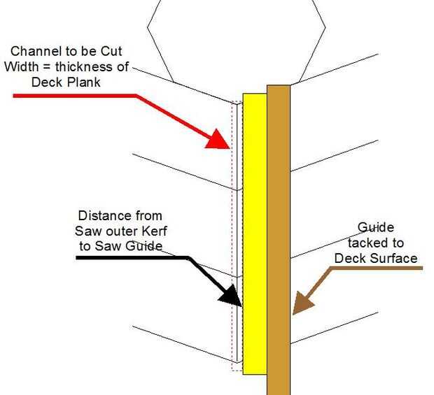 Utilice un trozo de madera no más gruesa que 1/4 de pulgada y virar la madera sobre la cubierta a la derecha de la línea dibujada una distancia igual a la medida de la guía de la hoja de sierra y paralelo a esa línea. Ver el rectángulo marrón en el diagrama de.