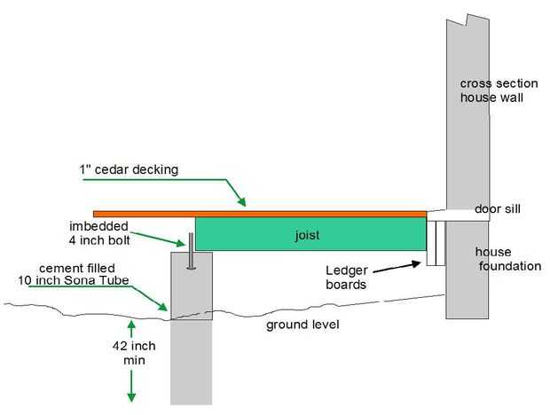 En la clavija del poste de centro, cavar un agujero por debajo del nivel de helada. En mi condado significa un mínimo de 42 pulgadas. Utilizar una longitud de 10 pulgadas tubo Sona en este agujero. Antes de verter el hormigón, marque la altura de la pour marcando la periferia del tubo Sona en un momento de un ancho de viga y un espesor de tablón de cubierta, por debajo del nivel de su umbral de la casa. Corte el tubo de la Sona a esta altura, el concreto premezclado y verter en la parte superior. Colocar un perno de carruaje de 4 pulgadas en el centro. He utilizado un tornillo de 3/4 de pulgada. No usar varillas, desea.