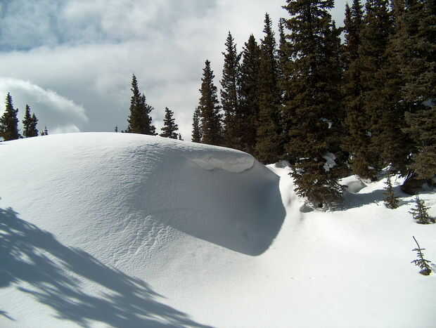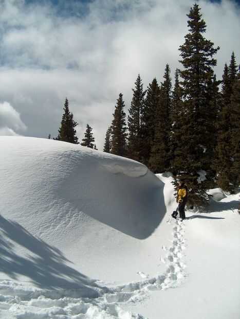 La deriva que me gusta es en el borde de un amplio espacio abierto y la nieve se apila realmente agradable cada año. Esta deriva llega a ser aproximadamente 20' alta, 40' ancho y unos 100' de largo. Verá cuán pequeño mi pareja se ve en la foto. Una deriva "madura" como este es grande porque la nieve es bonito y lleno. Un montículo de nieve esponjosa ligera que no no funciona. Incluso si fueras capaz de conseguir algo en existe posibilidad podría colapsar. Esto sería realmente malo para cualquier persona dentro.