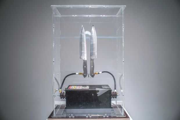Este Instructable le mostrará cómo crear una escalera Jacob. Construido este dispositivo para ser parte de La orquesta de cuchillo eléctrico que se puede ver en el video de arriba. Escaleras de Jacob son increíblemente simples desde un punto de vista de la electrónica, un transformador de alta tensión conectado a dos electrodos, en nuestro caso, cuchillos. La magia sucede porque el voltaje es lo suficientemente alto como para ionizar el aire entre los electrodos creando su propio rayo personal.