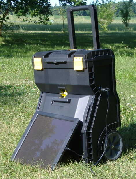 Estación de energía solar portable o de emergencia. Estadísticas: 120W (95? max hasta ahora), 12V 80Ah AGM batería solar, MPPT controlador de carga solar, inversor de 400W (utiliza 0.8 A cuando en), 3 ventiladores de refrigeración (en/hacia fuera del