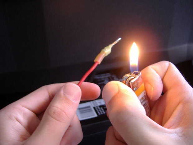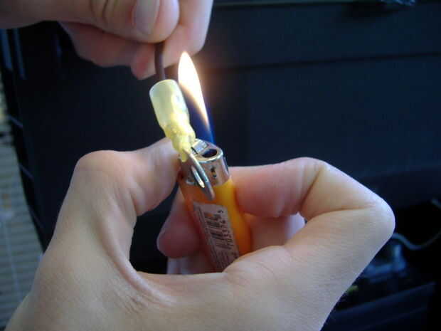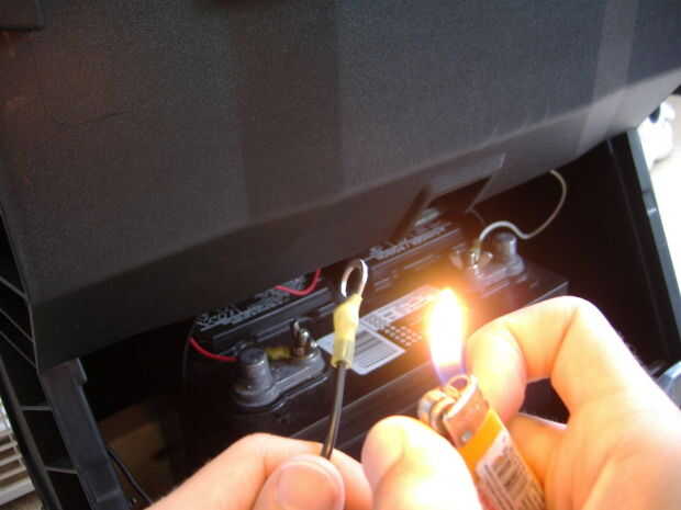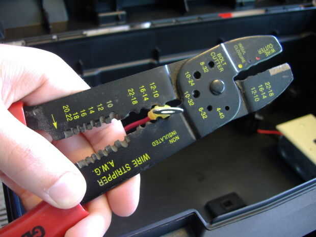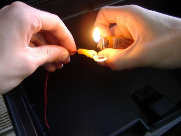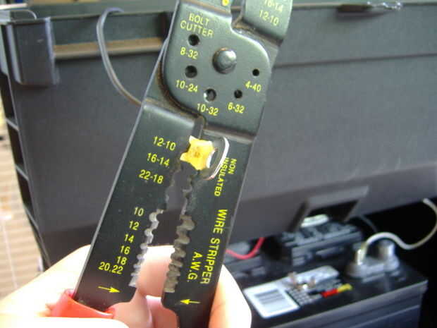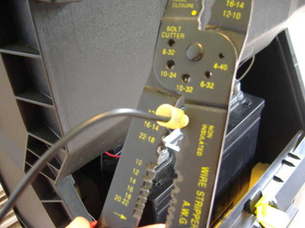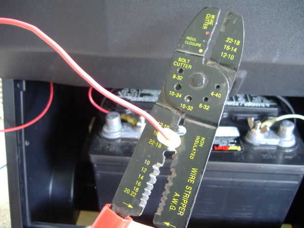 Primero los orificios perforados y recorrió los dos cables. Luego corte y pelado los cables sólo el tiempo suficiente para llegar a la batería del inversor. Después de eso prensado pequeño anillo conectores en los extremos del inversor de los cables y los grandes en los extremos de la batería. Una vez que ambos extremos de ambos cables conectores de anillo, encogi el encogimiento del calor con un mechero.