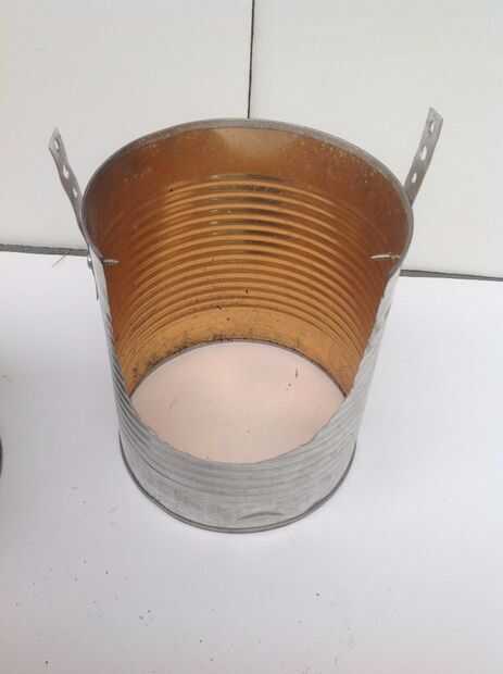 Con el abrelatas, cortar la parte inferior al lado de una de las latas no. 10, guarde el disco del metal para un paso posterior. Corte un gran semicírculo por el lado de la can, sin embargo, no se corte más allá de los puntos a la mitad de la lata. Luego, corte una tira de 4 a 5 pulgadas de fleje de metal y tornillo en ambos lados de la lata. Asegúrese de que las caras de flejado vertical después de apretar.