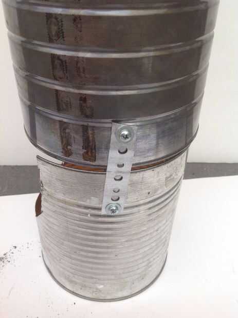 Sujeta las dos latas encima de la otra, el poder con el orificio grande en el lado que va en la parte inferior. Esto actuará como un soporte y un agujero de aire para que la estufa.
