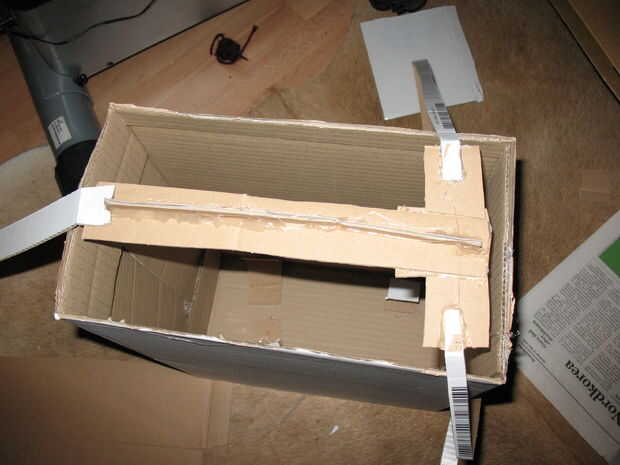 cortar tres de ~ 2 cm de ancho (varillas de empuje) de tiras de cartulina de unos 15 cm más de largo que la caja es alta, pista cada extremo al titular del depósito (ver imagen)
