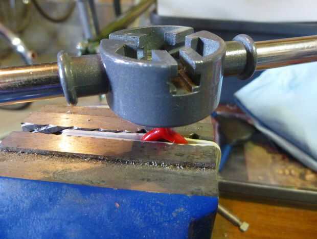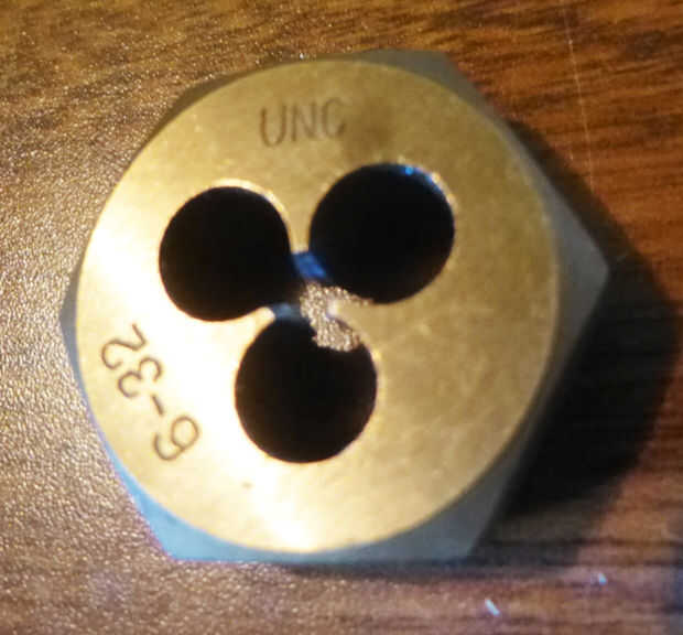 La matriz final debe ser un 6/32 UNC como se muestra en la imagen. Simplemente Sujete el gancho en una prensa y comience a roscar. Espero que tengas un grifo y die set o conoce a alguien que lo hace.