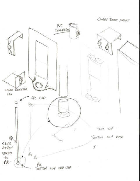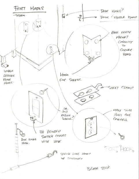 La primera cosa a hacer era dejar el lápiz el papel del golpe. Me colgué el tubo de pvc por un tiempo, pero en algún lugar a lo largo de la línea tuvo la idea de alguna manera crear puntos de fijación en la pared. Mi idea original involucrados imanes de tierras raras. Quería ver si podía encontrar imanes suficientemente fuertes para soportar las hojas en una pared. Quería pegarlos a los tornillos de la mampostería seca y el grano de la esquina de metal. Lamentablemente, no pude lograr el poder que buscaba, e imanes de tierras raras no son que seguro para los niños a jugar con todos modos. Finalmente decidí buscar otras maneras fijar las hojas a la la pared. Nació la idea para ganchos de Fort. (Más tarde ha cambiado esto por lazos de fortaleza, porque el diseño es de hecho un bucle y no un gancho)