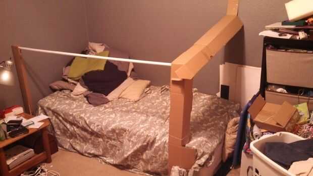 Este esquema necesita algunas líneas más. La tienen que tener más estructura. Esto es donde el cartón. Tomar la cartulina y córtala en tiras gruesas, como referencia por las imágenes. Sólo utilicé el cartón para 3 bordes de la fortaleza que hice. Las vertical dos "piernas" y la oposición "Brazo" o "Lado de la azotea" fueron puestos en lugar para que la fortaleza entera tendría algún tipo de estructura. Las patas de cartón deben ser del mismo tamaño que los palillos de su marco, así puede adjuntarlos junto con cinta o algunos otros métodos. Realmente, la elección es suya.