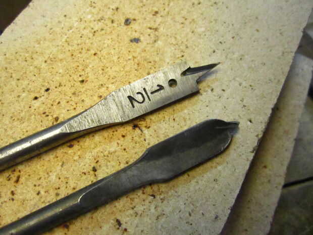 Usé (sacrificado) una paleta de 1/2" broca para cortar el agujero de entrada de gas. Funcionó, pero tomó mucho tiempo, y la broca quedó totalmente destruida. Si tienes unos duplicado 1/2" bits en su sistema de herramienta de la paleta, entonces usted podría hacer lo mismo. Después de todo, es buena herramienta acero por lo que se puede forjar un cuchillo de él cuando haya terminado. De lo contrario, sería más rápido usar una broca adecuada. El agujero no vino a través de exactamente donde quería, así que usé una lima redonda para ajustarlo.