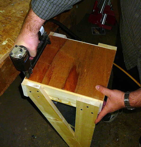 El fondo de madera contrachapada de 1/4" fue casi un pensamiento después, pero nos dimos cuenta que teníamos que proteger la mesa de la fuente de calor. Estas piezas se cortaron un pelo en tamaño para no ser vistos y fueron atados con un cordón de pegamento y unos clavitos.