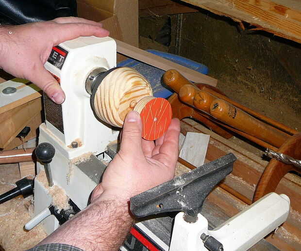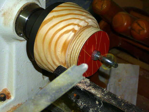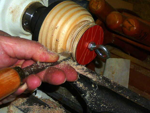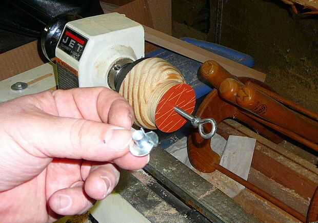 A continuación los discos de madera contrachapada se montan en mi mini torno. Has convertido un bloque de madera "Jamba Chuck" de pino sacrificial y han perforado un agujero de 1/4" a través del centro con una broca en una tirada. He vuelto una hendidura estrecha que el diámetro de los discos y de la parte frontal de la "tirada" He conducido un 1/4-20 tuerca Tee. Una de las fotos de abajo muestra una t-tuerca floja. T-Nuts son un simple martillo en inserto roscado que brindan una excelente resistencia, asegúrese de que el t-Nut está detrás de la madera que es conducido en y no en la parte superior. Bajo estrés el t-tuerca se va desplazando más apretada en la madera.