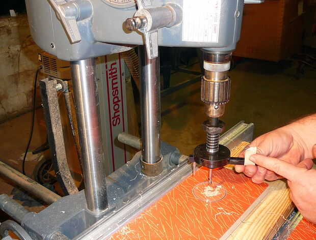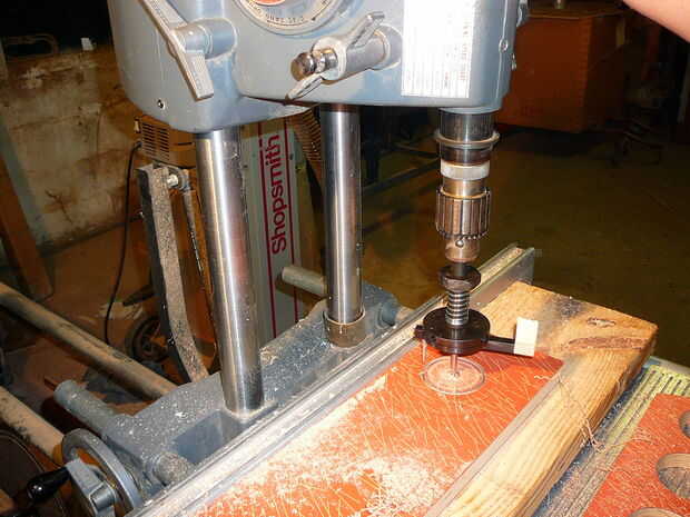 A continuación la Junta tendrá respaldo. Esto es algo que aprende rápidamente después de perforar el primer agujero a través de la mesa del taladro. La otra razón para esto es que mi taladro (Shopsmith Mark V) tiene un borde valla recta que será impactado por el nudillo-buster antes mencionados. Levantando el tablero de la mesa el cortador hará su lo largo antes de llegar a la altura de la valla.