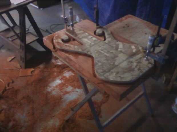 Pone el diseño de su cuerpo de guitarra en la hoja de madera contrachapada de 1/2 ''. Es útil dibujar una línea central y mantener su diseño algo simétrico sobre esa línea. La simetría hace que para un equilibrado bajo, pero ser creativo con su diseño. A continuación, utilice una sierra de calar para cortar la forma. Asegúrese de pulir cualquier marcas dejadas por la cuchilla de jigsaw con una lija de 120 grano. Lijado ayuda router deslice por el borde sin traducir cualquier protuberancias o filos para el cuerpo de la guitarra.  Utilizar la madera restante y repita el método jigsaw-lijado para hacer las plantillas para la cavidad de la electrónica, el bolsillo cuello y recolección de recortes. Una mano firme vale su peso en oro!