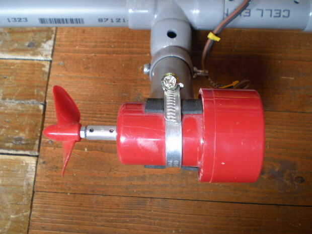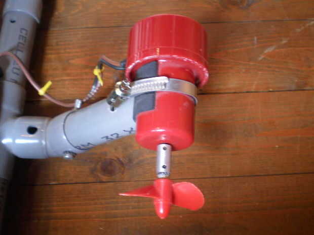 El motor se coloca en una U en forma de espacio presentada en el extremo de un pedazo de tubo de PVC.