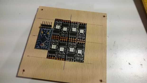 Ahora, corte la tira de Led en 4 trozos de 4 Led´s y pegarlas en el panel inferior. Luego pegue el puerto Arduino sobre el panel como se muestra en la imagen.