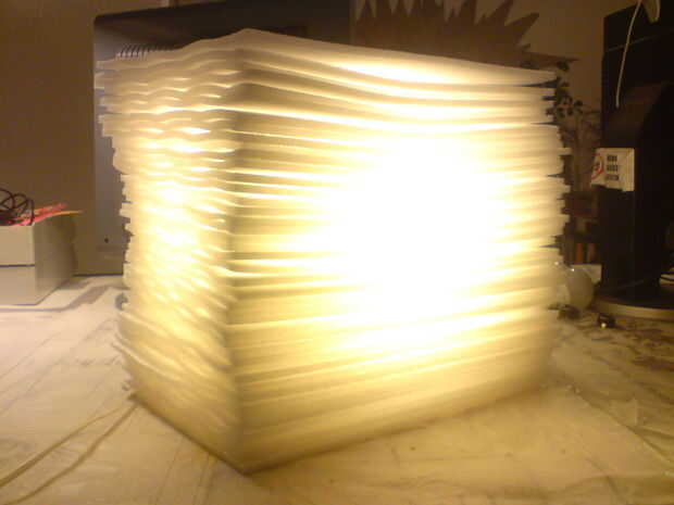 El principio básico es la siguiente: tomar una pila de envasado láminas de espuma, cortadas un agujero en él, pegar una bombilla en y listo. Sin embargo, una cosa importante es la ventilación, que es el foco del último paso de este instructable.