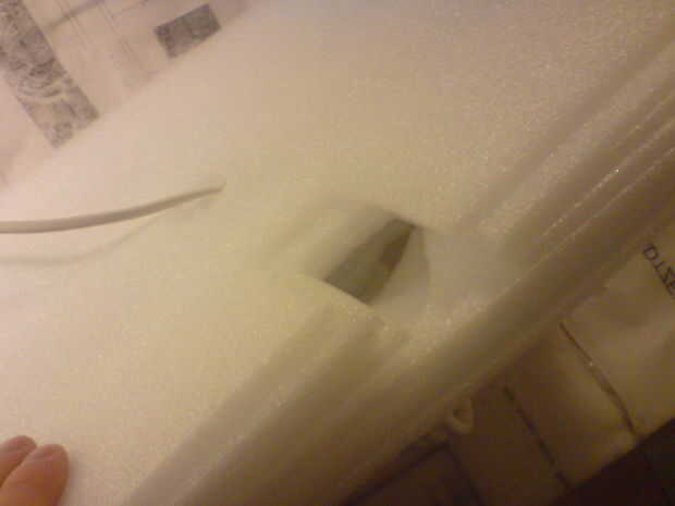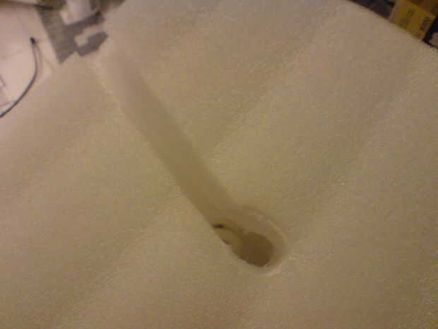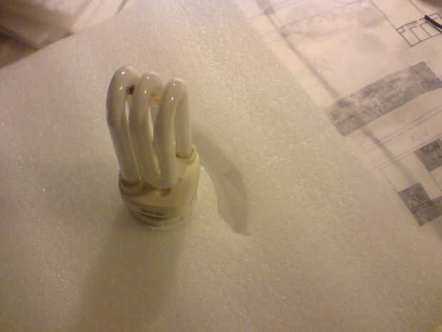 Gran error! El calor de la bombilla de 22 Watts comenzó a derretir la espuma casi de inmediato. Cuando lo apagado y comenzó a pensar sobre la ventilación.