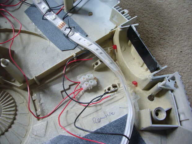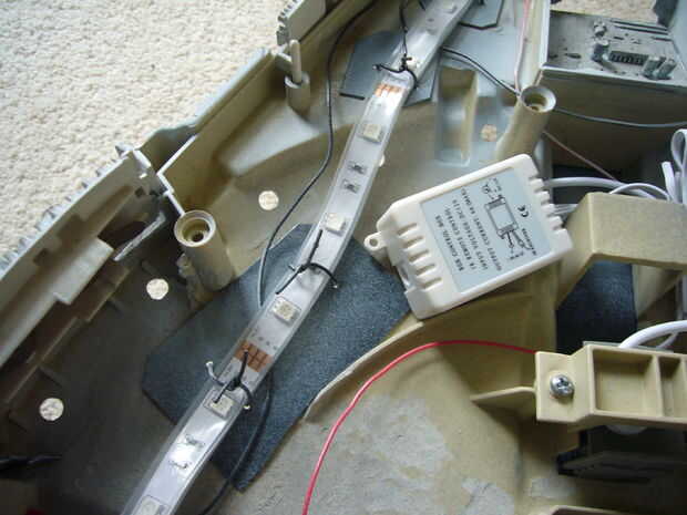 De todos modos, el kit de iluminación vino de eBay, solo buscar para tira de LED 5050. El kit es semi impermeable, escurr de 12v y puede controlarse mediante un pequeño control remoto, dando a 16 colores (así como efectos estroboscópicos y se descolora). Es un metro de longitud y utilicé trocitos de alambre para atar. Luces adicionales se han agregado y necesito para terminar esta parte del modelo, pero todos se conectará a la fuente de alimentación. El sensor de infrarrojos ha sido asomó a través de la pata delantera y permanece oculto de la vista.
