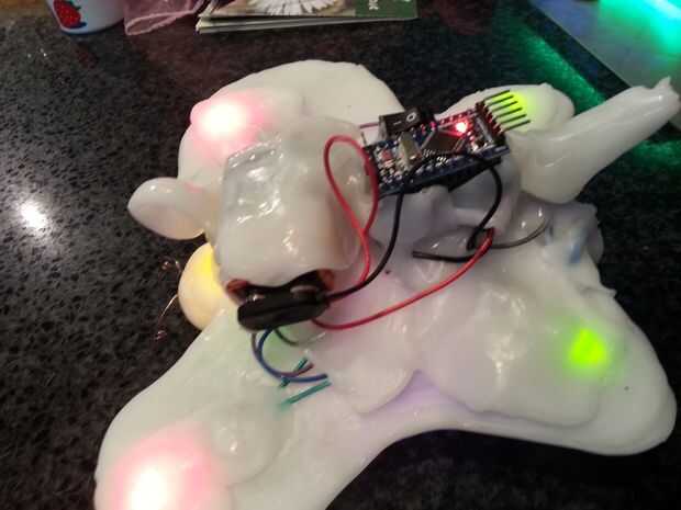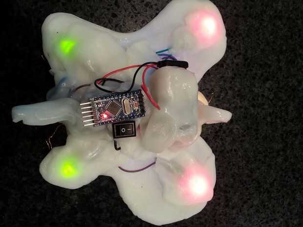para arduino había conectado en el zócalo y había encerrado las cabeceras con instamorph luego mientras estaba todavía calentito lo había pegado en la parte trasera de la mariposa. sólo asegúrese de que Arduino puede ser desconectado.