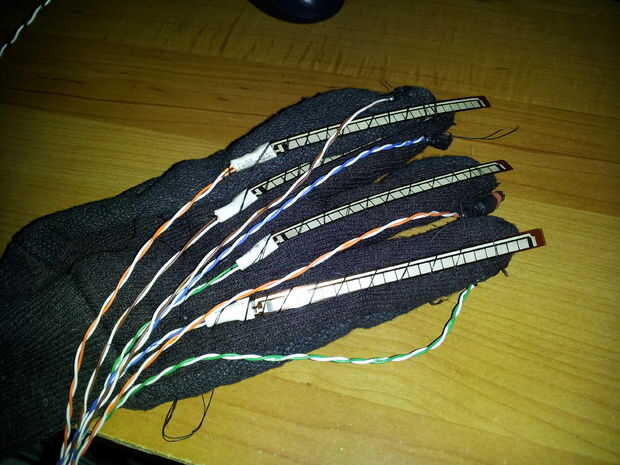 En mi mano, utilicé los pares de un cable Ethernet. La codificación de color había hecho cables más simple, pero los cables estaban un poco tiesas. La rigidez no afecta a la funcionalidad de la mano, pero hace el guante un poco extraño usar. Esto se puede solucionar usando alambre trenzado en lugar de cable de núcleo sólido.