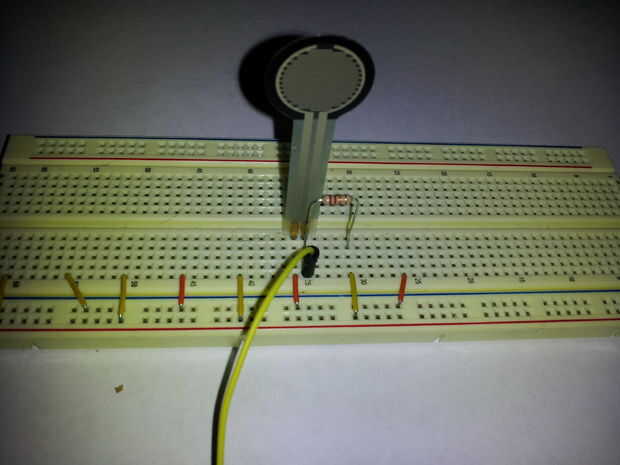 Cada uno de los sensores utiliza un divisor de tensión. Los FSRs una resistencia k 10, y las resistencias de flexión una resistencia k 22. El divisor de tensión trabaja con la resistencia a cambio de los sensores. Cuando la resistencia es mayor que la resistencia variable, hay una mayor caída de tensión en la resistencia variable. La tensión separadores vienen con + 5V y esa caída de 5V se divide entre las dos resistencias. El Arduino mide la tensión entre las resistencias y devuelve un valor entre 0 y 1023 basado en la lectura de tensión (0 siendo 0V y 1023 siendo 5V).