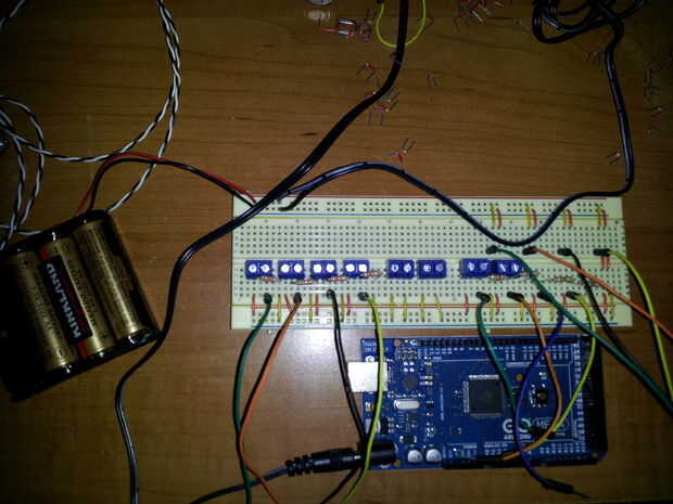 este año para la ciencia de la feria, hice un proyecto de ingeniería con el objetivo de crear un sistema para proporcionar retroalimentación háptica de una mano robótica. La mano robótica es controlada por flexión resistencias en un guante en la mano